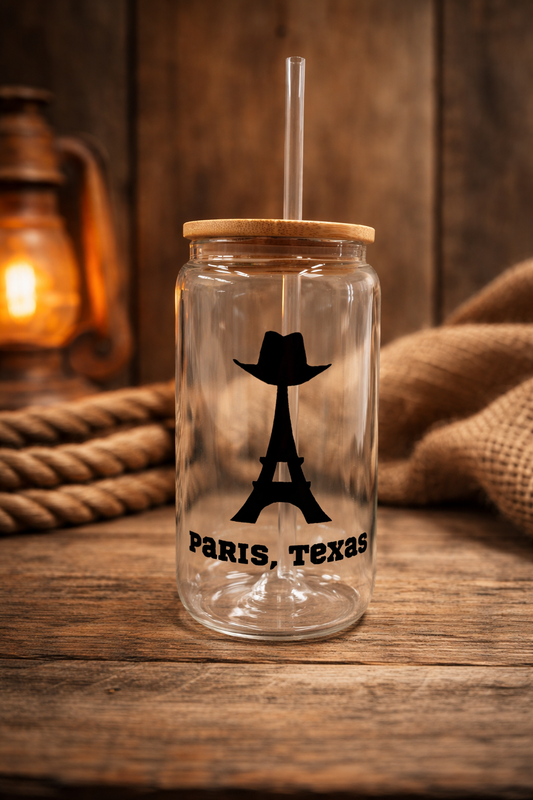 Paris Texas Souvenir 16oz Glass Can | Western Eiffel Tower Design